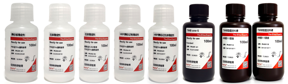 PNTK提供优化的酶标板稳定剂、抗体稳定剂、抗体稳定剂(竞争法ELISA专用)、HRP酶标记物稳定剂、HRP酶标记抗体稳定剂等,以保护抗体、蛋白、偶联物(如HRP酶、生物素等标记的抗体、蛋白或链霉亲和素)等。