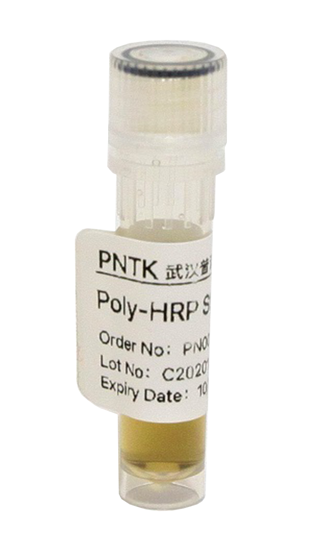 Poly-HRP-链霉亲和素(Poly-HRP-SA), 为多聚体辣根过氧化物酶(pHRP)标记的链霉亲和素(SA),与普通的单体HRP-SA相比,优点在于增长了间接臂及连接多个HRP,从而进一步提高了检测的灵敏度。